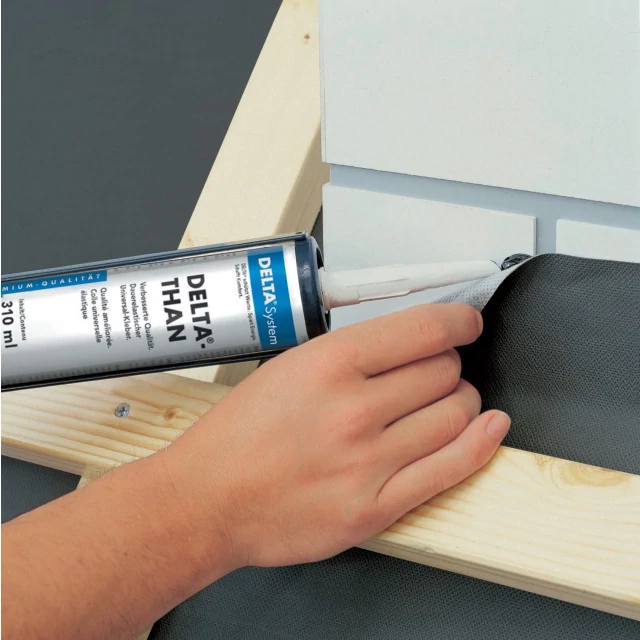 Tartósan rugalmas, speciális kaucsuk tömítőmassza, kültéri használatra, a páraáteresztő fóliák fal- kéményszerkezetekhez történő csatlakoztatásához Kiadósság kb. 10 fm / tubus.